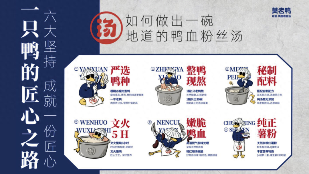 美御賦予莫老鴨“新派鴨血粉絲湯開創者”的定位,對莫老鴨的產品進行了全新梳理和升級創新,首先,提煉莫老鴨鴨血粉絲湯的差異化賣點——湯底采用整鴨現熬,嚴選鴨種歷經5小時文火熬煮;鴨血采用嫩脆鴨血,經過處理呈現天然鴨血香味;粉絲采用雜糧紅薯粉,Q彈爽口,營養健康。這不是一碗普通的鴨血粉絲湯,而是一碗承載著匠心制作、美味健康、營養豐富的鴨血粉絲湯。其次,做品類精細化——提出“全鴨”小食的新吃法,幫助莫老鴨以鴨血粉絲為核心,外加其他鴨品鴨類的小吃,組合成爆款套餐,給消費者提供新穎齊全的鴨血粉絲湯吃法,豐富消費者關于“鴨”的味覺體驗。