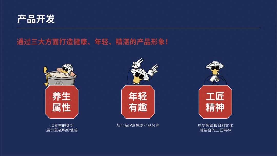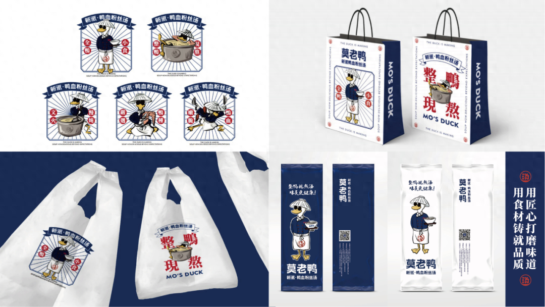 深入挖掘鴨血粉絲湯市場、消費者需求和莫老鴨自身資源優勢后,美御定制出以一碗“安全放心+天然健康+真材實料”的鴨血粉絲湯為核心+全鴨小食搭配的產品定位,用新餐飲+新零售的模式,通過“養生屬性+年輕有趣+工匠精神”三方面,全新打造莫老鴨健康年輕精湛的品牌形象。希望不僅能消除人們對鴨血粉絲湯的消極印象,更借此傳達莫老鴨品牌主張和匠心精神,真正將其做成「新派·老鴨粉絲湯」。