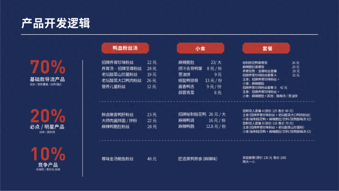 提升店鋪業績需要解決2個問題:客單價和翻臺率。莫老鴨之前和大多數商鋪一樣,存在客單低、菜式單一、制作流程不規范、店鋪翻臺慢的問題。美御從產品入手,按“721法則”,70%基礎款導流產品+20%必點明星產品+10%競爭產品的策略,定制引流套餐和高單價套餐,形成盈利菜單體系,在保留經典的同時創造莫老鴨新派產品系列。