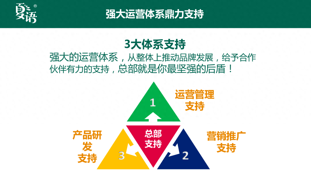 美御根據多年來在快消品行業的觀察與過往案例總結,為「夏語」定制了詳實的招商政策,建立運營管理、營銷推廣支持、產品研發支持三大體系協助「夏語」全國招商,并提供相應的培訓管理服務,幫助品牌完成可持續的長期商業增值。